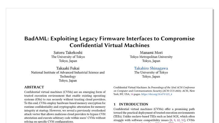 本論文は、近年注目を集めている機密仮想マシン(Confidential VM)に対し、ハイパーバイザからの任意コード実行を可能にする攻撃「BadAML」と、その防御手法である「AML Sandboxing」を提案しています。