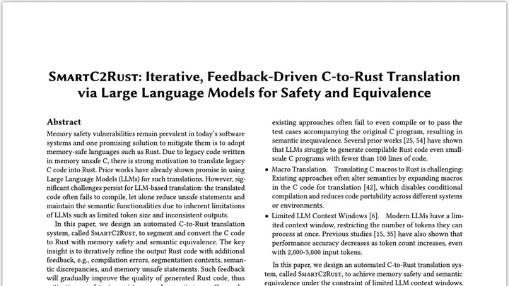 本論文では、Large Language Models (LLMs) を用いて数千行規模の C 言語プログラムを Rust に自動変換する手法 SmartC2Rust を提案しています。既存手法では、LLM のコンテキストウィンドウの制限や出力の非一貫性により、コンパイルエラーや unsafe の残存、C コードとの意味的不整合といった問題が生じていました。SmartC2Rust は、元の C コードを適切な単位に分割し、LLM からのフィードバックを用いて翻訳結果を反復的に改善することで、意味的に等価で安全な Rust コード変換を実現します。